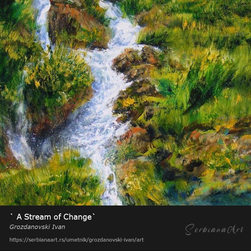 Artist's description: " A Stream of Change "...Impressionistic style....... ....Painted with expressive moves...........with a lot of emotion!!!... Large Painting W46xH81cm I'm giving all best, to be represent the true colors of the paintings in the photos, but sometimes you can see a little difference in tone.. I take good care packing my art,so it comes to you in the great shape. Note !!! The painting on the wall of the room is not in true scale....!!!! All my artwork is original !!!! Materials used: Acrylic ( Liquitex)..... on the end covered with a satin coat of varnish, to protect it for the UV and dustPodelite i promovišite ovo delo