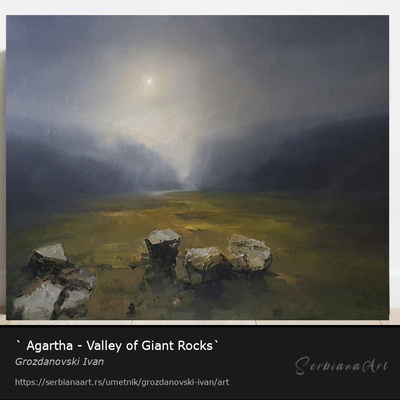 Original artwork description: " Agartha - Valley of Giant Rocks "...Painted with expressive moves.......with pallet knife and with a brush.....W 125 x H 100 cm I'm giving all best, to be represent the true colors of the paintings in the photos, but sometimes you can see a little difference in tone.. I take good care packing my art, so it comes to you in the great shape. Note !!! The painting on the wall of the room is not in true scale....!!!! All my artwork is original !!! Materials used: Acrylic ( Liquitex) & Oil ( Van Gogh ) ......quartz sand,... on the end covered with a satin coat of varnish, to protect it for the UV and dust.Podelite i promovišite ovo delo