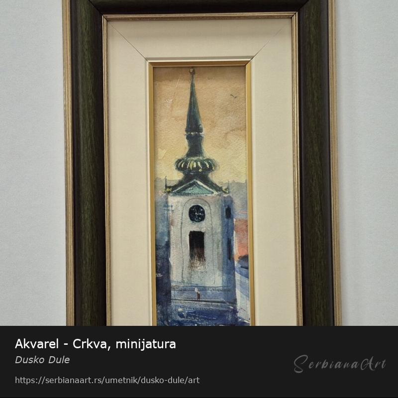 Slika Crkva, tehnika akvarel. Minijatura. Slika je uramljena u jako lep ram, dimenzije slike sa ramom 38 x 24. Privatna kolekcija.