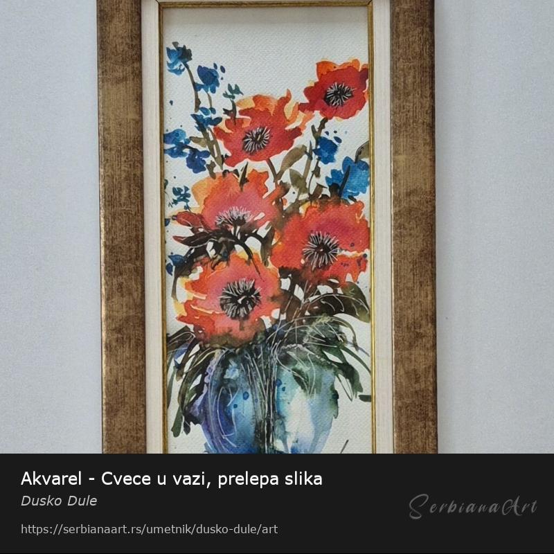 Slika Cvece u vazi, tehnika akvarel. Prelepo umetnicko delo. Slika je uramljena u jako lep ram. Ram, paspartu, staklo. Dimenzije slike sa ramom 43 x 23. Privatna kolekcija.