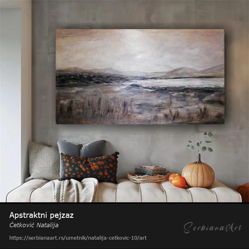 Apstraktna slika, pejzaž u bež sivim i belim tonovima. Akril