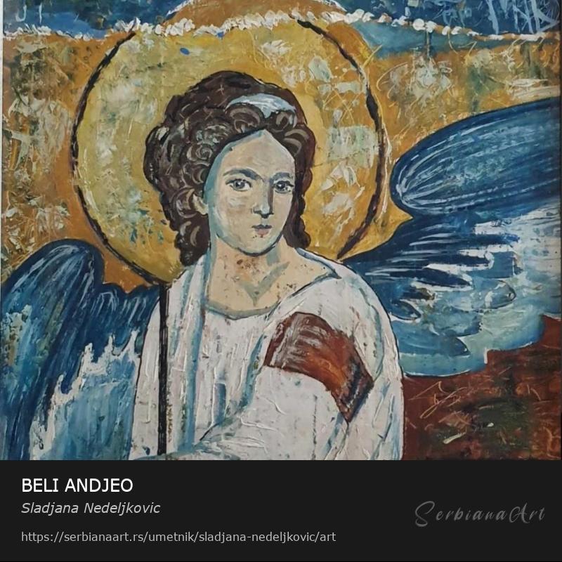 Ova ručno rađena slika anđela čuvara donosi snagu tišine i spokoj neba u svaki prostor. Zlatna aura oko glave simbolizuje božansku svetlost, dok plava krila i beli plašt šapuću priču o zaštiti, nadi i unutrašnjem miru. Pogled anđela je blag, ali prodoran – kao da zna nešto što mi tek pokušavamo da shvatimo.