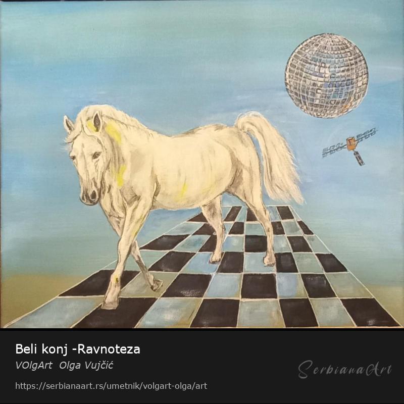 Ova kompozicija istražuje dualnost ljudskog postojanja – balans između instinkta i razuma, slobode i discipline, prirode i tehnologije. Beli konj u pokretu simbolizuje napredak i prilagodljivost, dok disko kugla i satelit zajedno stvaraju kosmičku dimenziju, podsećajući na stalnu interakciju između uživanja u trenutku i uticaja spoljnog.