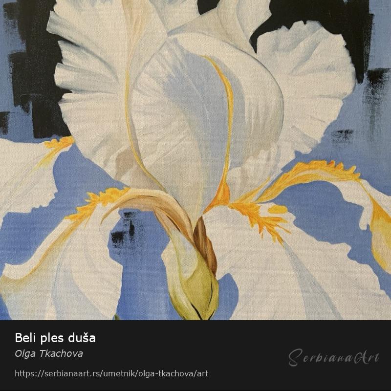 Ова уљана слика приказује елегантну белу перунику у пуном цвету, њене нежне латице се лепршају попут свиле на ветру. Цвет доминира контрастном позадином тамноплавих тонова који истичу њену крхку лепоту и чистоту. Жути детаљи доносе дашак топлине и живота. Дело зрачи миром и величином - попут тихог плеса природе под зраком сунчеве светлости.