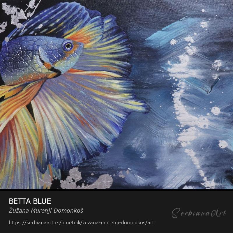 „BETTA BLUE“ je deo moje kolekcije Natura. Karakter slike je zadivljujući i moćan, pa dominira prostorom. Nijedna fotografija ne može predstaviti sliku u njenoj lepoti i snazi, sve ovo može biti samo referenca. Kada posmatrač u mojoj slici pronađe delić svog sveta, sopstvenu istinu, moja umetnost oživi. Drago mi je da moje delo dirne nečije srce. Za kraj, jedan savet: kupujte umetnost srcem, a ne glavom. ************************************************************************************* Akrilik na platnu velike dimenzije. Bogata tekstura urađena sa mešovitom tehnikom. Slika je obojena oko ivica i može se okačiti bez okvira. Završni sloj je sjajni lak, koji štiti sliku od štetnih uticaja. Svaka slika je potpisana i poseduje sertifikat autentičnosti. Nudim 100% garanciju! ...(kupcima u Srbiji) Posle Vaše uplate na moj tekući račun (200-109430129-24), šaljem sliku poštom. Ako slika nije po Vašoj zamisli, možete vratiti u roku od 5 dana, uz povraćaj novca. Troškove transporta plaća kupac. 80