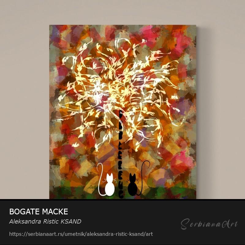 "Bogate mačke" prikazuju belu i crnu mačku koje spokojno posmatraju svoje raskošno drvo, simbol prosperiteta i obilja. Ovo bujno, crno/belo drvo simbolizuje čist početak i trud, dok okolne boje koje podsećaju na zlato, srebro, bronzu i novac predstavljaju uspeh, stabilnost i nagrade koje dolaze s posvećenošću.