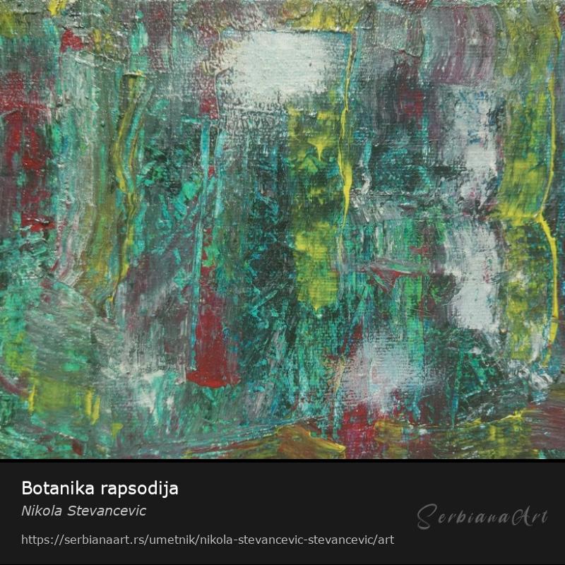 Botanička rapsodija pršti slojevitim zelenilom, zlatnom svetlošću i dubokim grimiznim akcentima, preplićući divlju lepotu prirode u apstraktni pejzaž snova. Teksturirani potezi i živopisni kontrasti dočaravaju ritam skrivene bašte, gde se boje njišu poput muzike na povetarcu