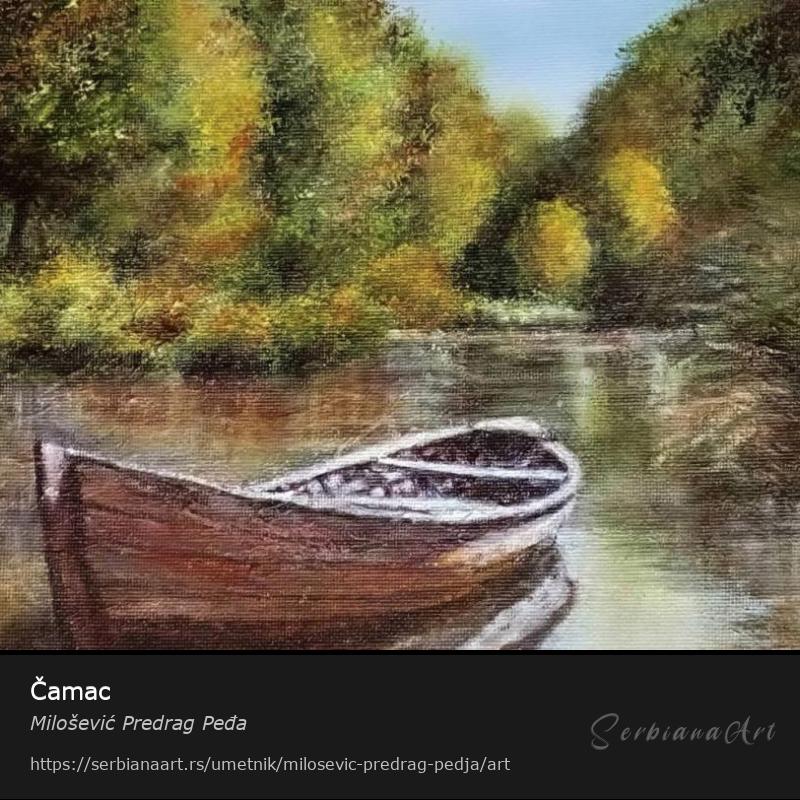 Na slici je prikazan miran jesenji pejzaž s pogledom na tiho rečno okruženje obojeno toplim jesenjim tonovima. Površina reke blago se presijava i odražava zlatno i narandžasto lišće s obala. U središtu prizora nalazi se mali čamac koji spokojno stoji na vodi, stvarajući osećaj mira i tihe iščekivanosti. Mirna voda dodatno naglašavaju atmosferu tišine i smirenosti. Ceo prizor odiše toplinom, spokojem i blagom setom karakterističnom za jesen.