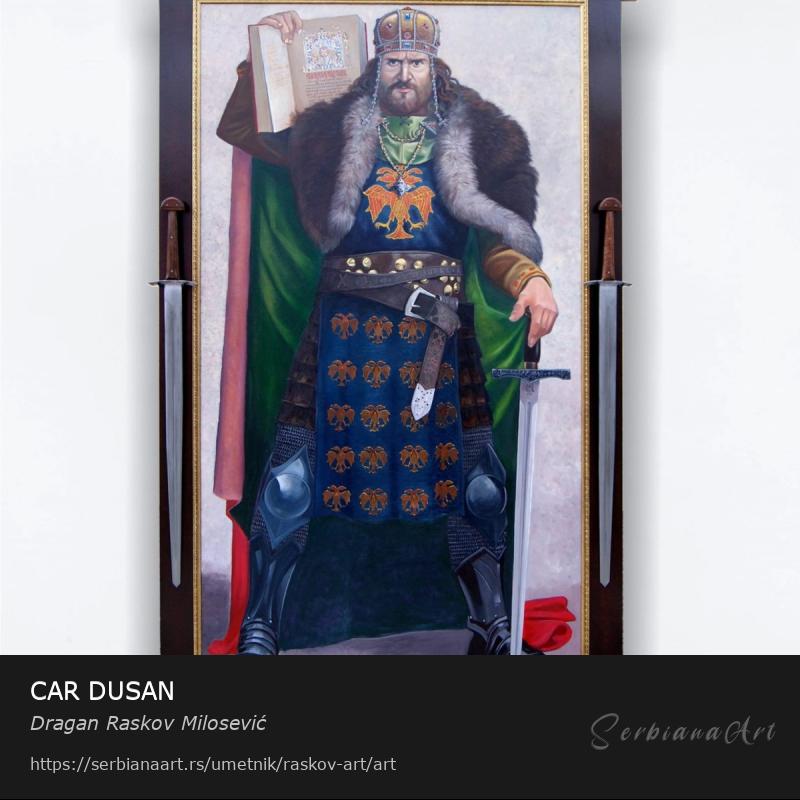 Car Dušan prikazan u stojećem stavu i drži zakonik na ramenu