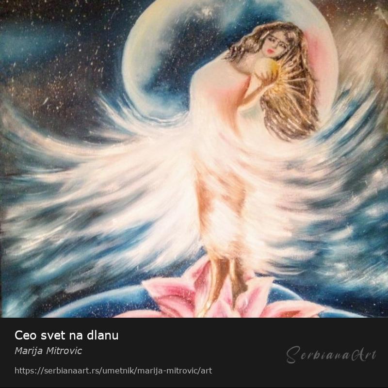 Slika je uradjena na slikarsko platno sa kvalitetnim uljanim bojama.Slika prestavlja mladu devojku koja je stala na lokvanj i u ruci drzi srebrnu kuglu, ceo sve na dlanu.Lepa deracija za svaki dom moze kao ka poklon.Cena slike je za Srpsko trziste+dodatni troskovi za inostranstvo.