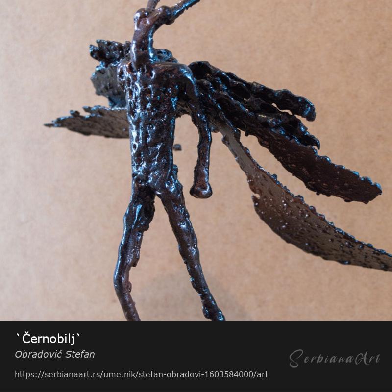 Skulptura pod nazivom `Černobilj` urađena od otpadnog metala i ofarbana bojom za metal. Tehnika rada je zavarivanje i brušenje. Skulptura simbolizuje događaj koji se dogodio u Černobilju i posledice toga. Ukupna visina skulpture oko 25cm. Dimenzije osnove postolja 9x6cm a visina 3,5cm. Autor Stefan Obradović predstavnik marginalne umetnosti. Rad nastao tokom 2021. godine.Podelite i promovišite ovo delo