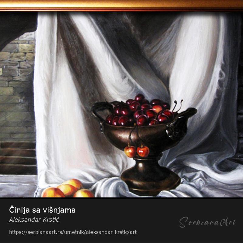 Ulje na platnu ``Činija sa višnjama``, 80x65cm. Slika je prodata, ako ste zainteresovani možete poručiti sliku, dogovoriti se oko cene, formata i dobijete je za 15 dana. Autor slike: dipl. graf. diz. mr. Aleksandar Krstić Naziv slike: Činija sa višnjama Veličina slike: 80x65 cm (uramljena) SVE MOJE SLIKE SU RAĐENE PRVOKLASNIM ULJANIM BOJAMA, KOJE GARANTUJU POSTOJANOST I DUGOTRAJNOST, NA PROFESIONALNO PRIPREMLJENOM PLATNU!Podelite i promovišite ovo delo