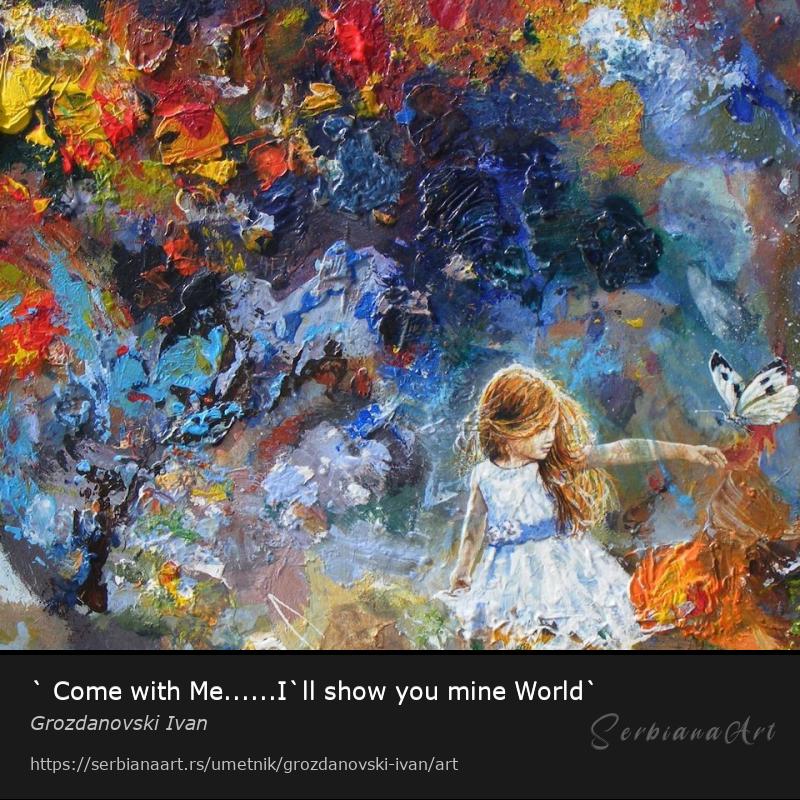 Artist's description: " Come with Me......I'll show you mine World "......Painted with expressive moves.....!!!... ....New painting from the series of paintings "Stories of White Butterflies". Impressionistic ( Abstract) style......I'm giving all best, to be represent the true colors of the paintings in the photos, but sometimes you can see a little difference in tone..... I take good care packing my art,so it comes to you in the great shape. Note !!! The painting on the wall of the room is not in true scale....!!!! All my artwork is original !!!! Materials used: Acrylic ( Liquitex) & Oil ( Van Gogh)..... on the end covered with a satin coat of varnish, to protect it for the UV and dustPodelite i promovišite ovo delo