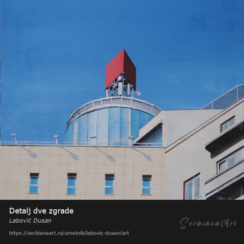 Slika detalja dve zgrade od kojih prva predstavlja primer savremenog graditeljstva. Uz kupljenu sliku isporucuje se gratis specijalna drvena kutija, namenjena za slučaj odlaganja slike, u kojoj je slika zaštićena od atmosferskih uticaja.