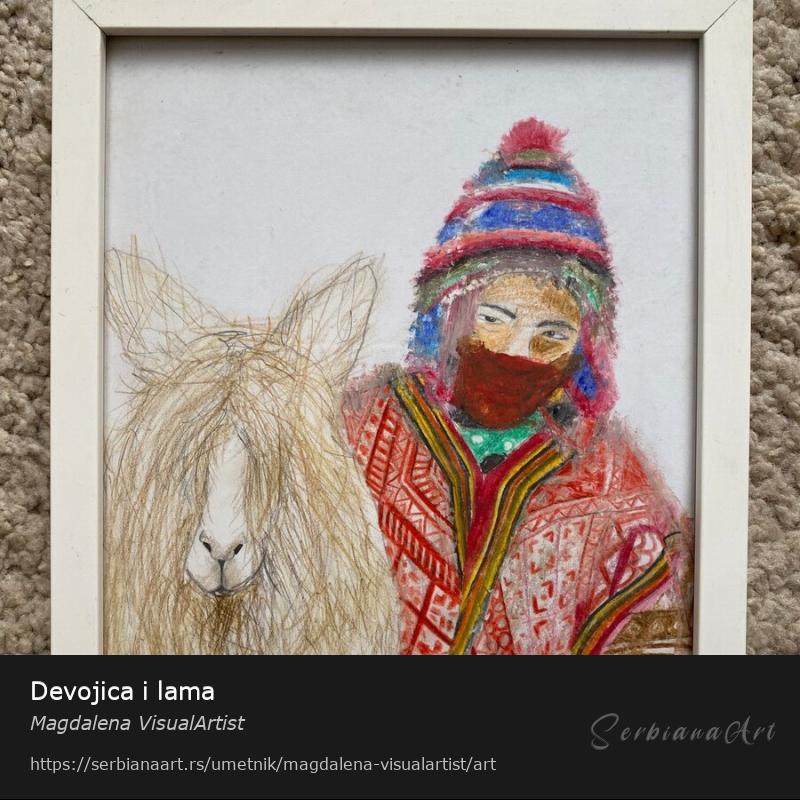 Crtez devojcice sa maskom i lame, kombinovana tehnika na papiru, uramljeno.