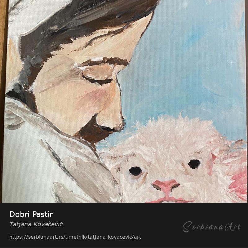 Ova nežna i emotivna slika prikazuje Hrista kao Dobrog Pastira koji sa ljubavlju i pažnjom drži jagnje u naručju. Inspirisana je biblijskim stihovima iz Jovana 10:11 i Isaije 40:11, koji govore o zaštiti, brizi i milosti. U ekspresivnim potezima četkice i toplim tonovima ogleda se duhovna tišina, sigurnost i nežnost božanske ljubavi.