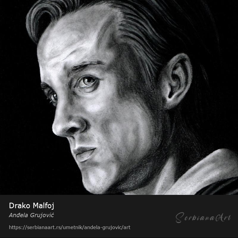Ovo umetničko delo je portret Draka Malfoja, jednog od mojih omiljenih likova iz serijala o Hariju Poteru. U pitanju je crno-bela tehnika, kombinacija suvog pastela i grafitne olovke. Još jedan intrigantan lik koga vole milioni ljudi širom sveta. Ovog lika tumači Tom Felton talentovan glumac pun harizme.