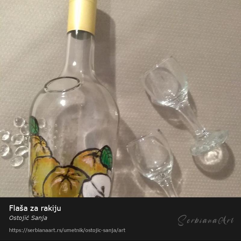 Poklon flaša. Ručno oslikana flaša za rakiju od dunje transparentnim bojama za staklo marke Marabu. Zapremina flaše 0,7l.Aluminijumski čep 30x60mm zlatniPodelite i promovišite ovo delo