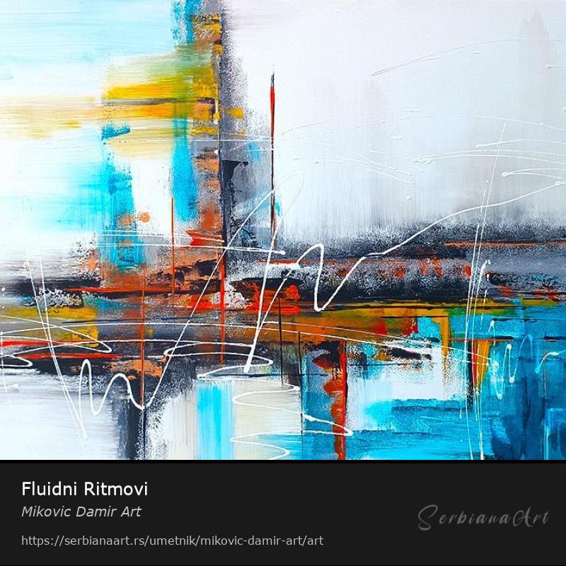Fluidni ritmovi je apstraktna umetnička slika koja istražuje delikatnu ravnotežu između strukture i spontanosti. Kroz bogatstvo slojeva plave, narandžaste, bele i sive, umetnik stvara dinamičnu kompoziciju koja odiše energijom i smirenošću istovremeno. Slojevite boje se stapaju i sukobljavaju, stvarajući vizuelno interesantnu i emotivno intenzivnu celinu. Oštre i jasne linije, u kontrastu sa mekanim prelazima, dodaju strukturu i dubinu, dok bela kaligrafija nežno prožima kompoziciju, dajući slici eleganciju i fluidnost. Ova slika je savršena za moderan enterijer, donoseći dozu kreativne energije i harmonije u svaki prostor.