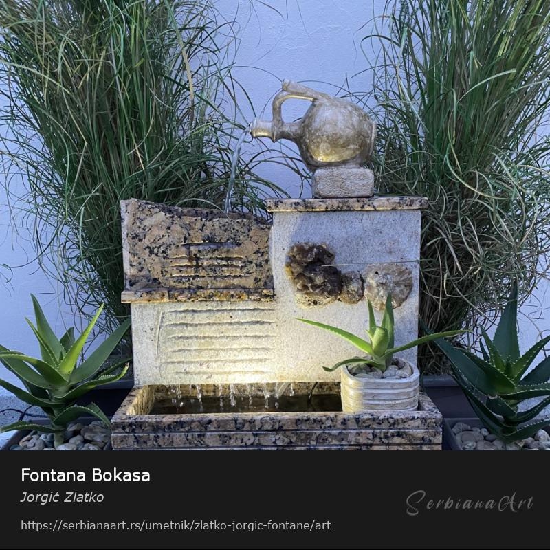 Fontana Bokasa, model za dvorište, terasu ili poslovni prostor, izrađena od granita kašmir gold i keramičke posude. Fontana je ukrašena prirodnom sukulentnom biljkom. U fontanu je ugrađeno RGB LED osvetljenje koje vi prilagođavate po vašem afinitetu. Fontana se jednostavno održava i servisira. Žubor vode je harmoničan i umerene jačine.