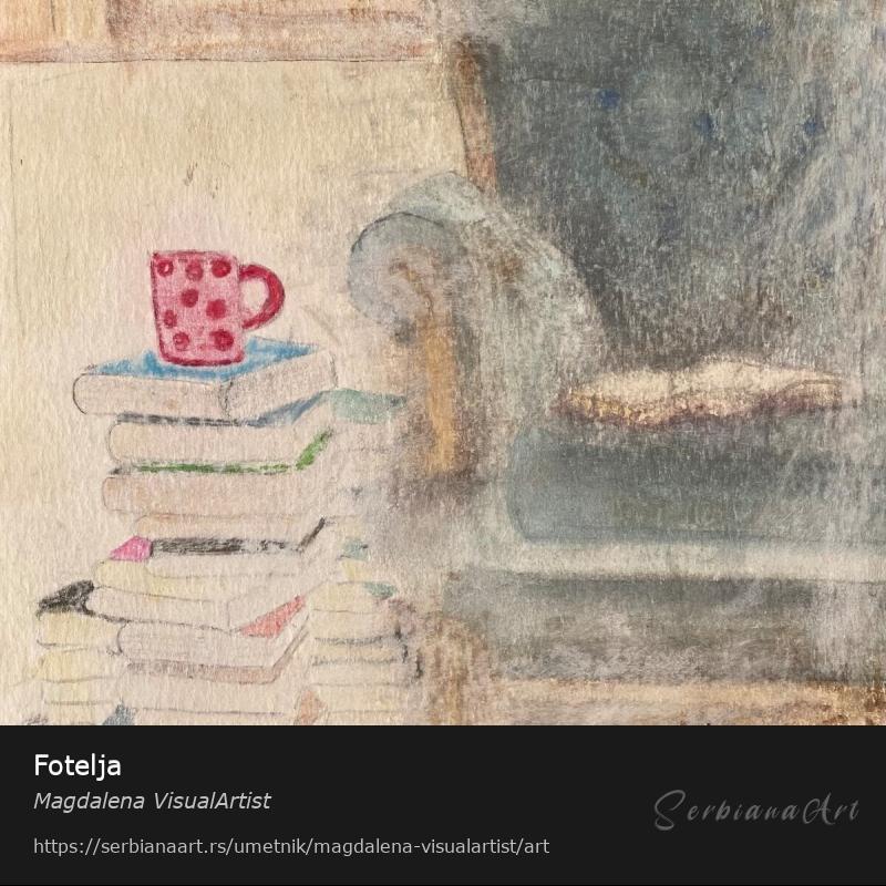 Prikaz fotelje i gomile knjiga