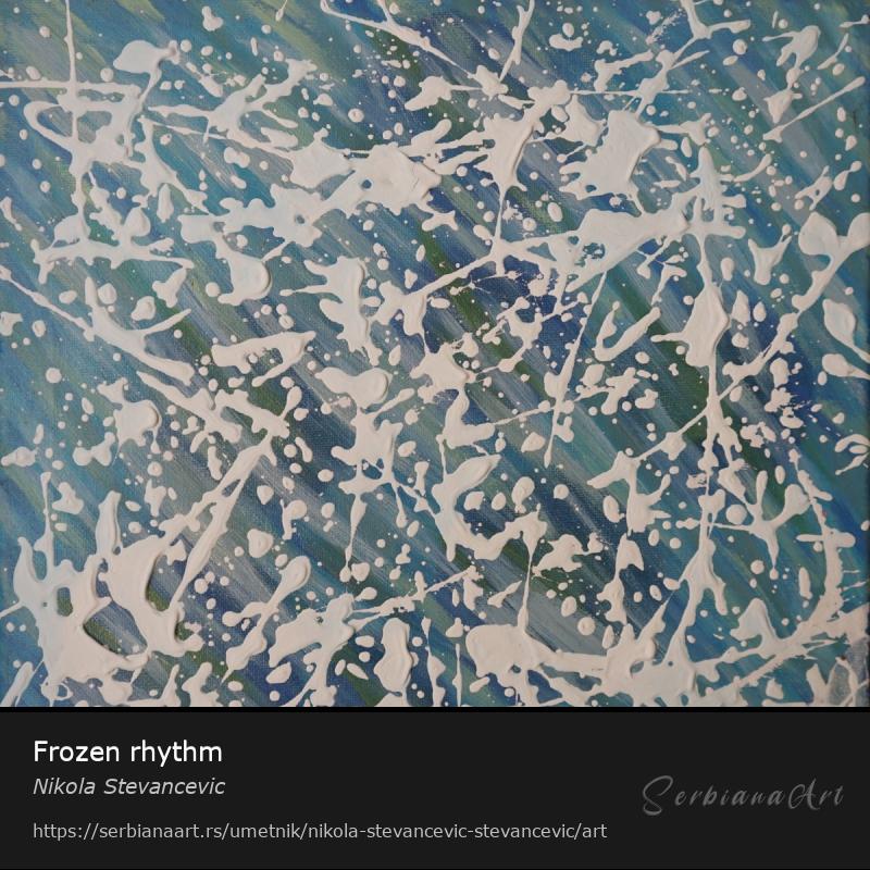 Hladni tonovi okeansko plave i šumsko zelene stvaraju vrtložnu pozadinu za smela, snežna prskanja koja se presecaju poput zamrznutog pokreta. Zamrznuti ritam evocira osećaj pokreta zaustavljenog u vremenu - poput leda koji hvata sećanje na vetar ili zvuka koji odjekuje kroz tišinu.