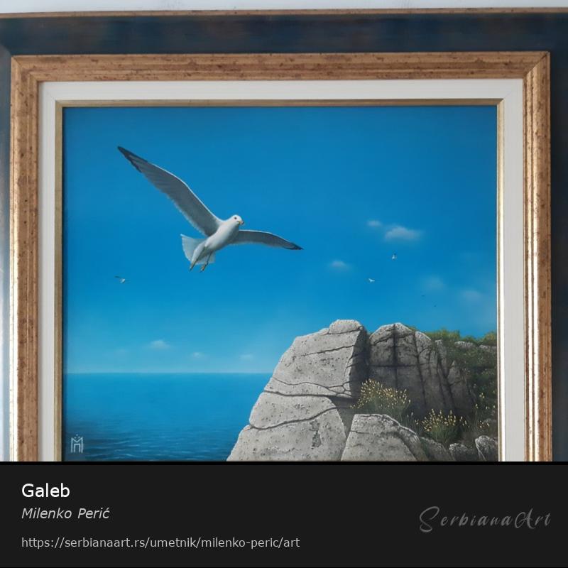 Monotipija na platnu sa doslikanim detaljima, Galeb 35x42cm, uramljena, sa mesinganom pločicom.