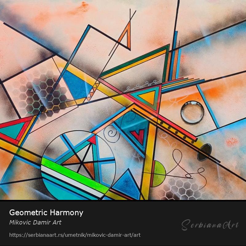"Geometrijska Harmonija" je apstraktna umetnička slika koja istražuje sklad boja, oblika i linija kroz dinamičnu kompoziciju. Ova slika je rezultat pažljivog istraživanja geometrijskih oblika i njihovih interakcija, stvarajući uravnotežen i harmoničan vizuelni doživljaj.