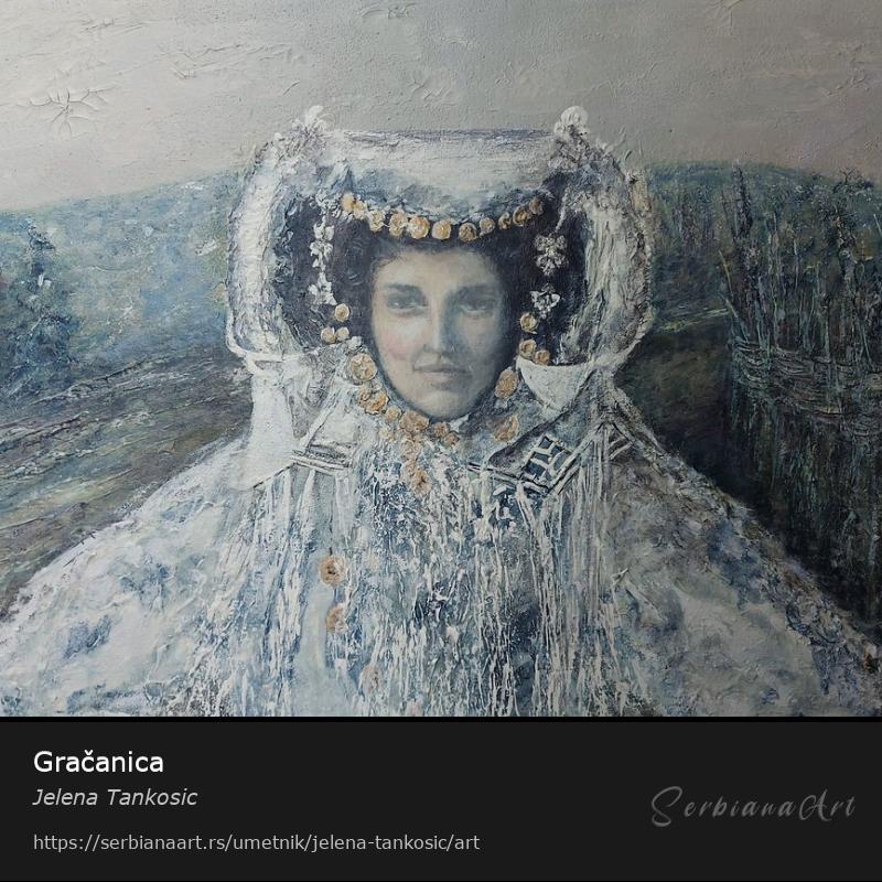 Serbian painter Jelena Tankosic`s works can be found in private collections worldwide. Tankosic works with acrylic on canvas, which she occasionally augments with a touch of oil. Tankosic`s first concern is texture- once she is satisfied with the textural balance, she composes the forms. Inspired by symbolism and mythology, Tankosic often paints scenes from matriarchal societies, as well as images from nature. Joyful and ornate, Tankosic`s pieces fuse abstract impressionism with realism in richly textured scenes.Umetnik Jelena Tankosic (Srbija).