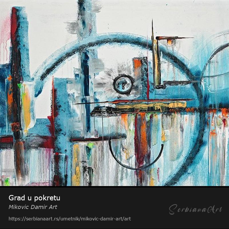 Ova apstraktna slika pod nazivom „Grad u pokretu” nosi snažnu dinamiku i ritam urbanog života. Kombinacijom ulja i akrila na platnu dimenzija 100x80 cm, umetnik stvara vizuelnu simfoniju boja i oblika koji podsećaju na arhitektonske forme i kretanje metropole. Dominantne nijanse tirkizno plave, crvene, narandžaste i crne u kombinaciji sa kružnim i linijskim elementima simbolizuju balans između haosa i harmonije u savremenom svetu. Savršeno se uklapa u moderni enterijer, prostor kreativnog rada ili galerijski ambijent. Autorski potpis i godina (2025) nalaze se u donjem desnom uglu, potvrđujući autentičnost dela.