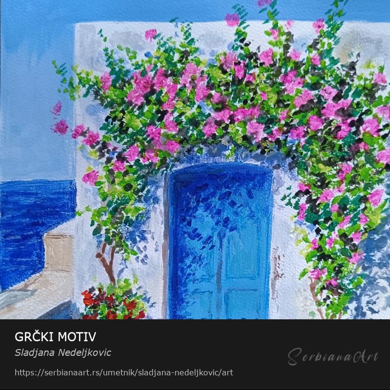 Na slici se nalazi prelepa terasa iznad plavog Egejskog mora, obasjana suncem. Dominira grčki ambijent – bela zidana kuća sa živopisnim plavim vratima, karakterističnim za ostrva kao što su Santorini ili Mikonos. Sa strane vrata buja cveće, u jarkim nijansama roze, narandžaste i crvene, koje se penju uz zidove i stvaraju osećaj topline i mediteranskog šarma.