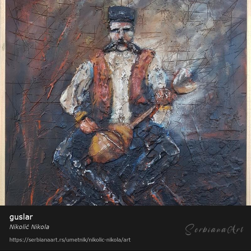 Guslar je uradjen na ploči od medijapana u reljefu i uljanim bojama.Uramljen je drvenim letvicama .