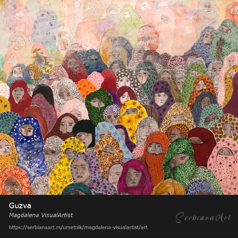 Gomila zena u gradu, kombinovana tehnika na papiru