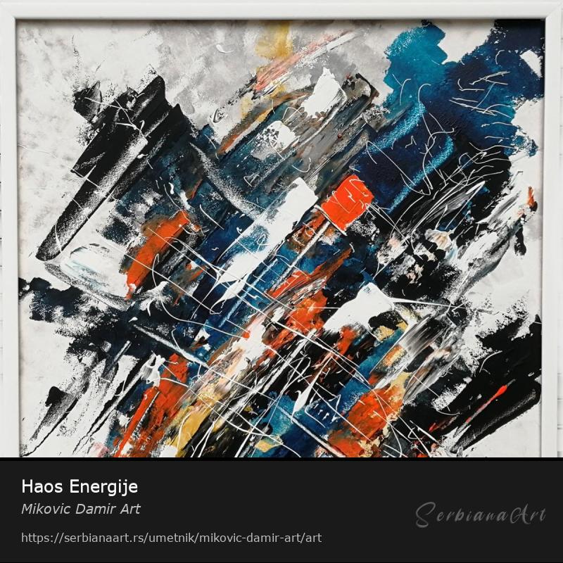 Ova apstraktna slika ističe se snažnom i haotičnom energijom, koja je izražena kroz kombinaciju tamnih i svetlih tonova sa jarkim akcentima. Plavi, narandžasti, crveni i crni tonovi stvaraju dinamičnu igru boja, dok bele linije, nasumično iscrtane preko kompozicije, unose osećaj pokreta i slobode. Oštro kontrastiranje tamnih i svetlih boja doprinosi dramatičnom utisku, dok guste i teksturalne nanose boje stvaraju vizuelnu dubinu i kompleksnost.