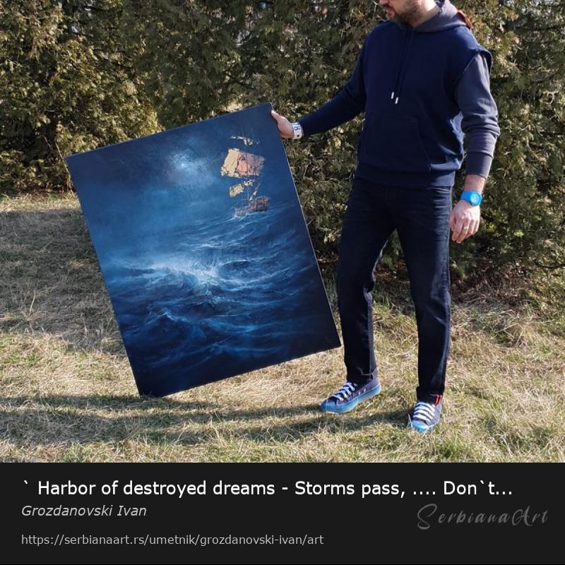 Original artwork description: " Harbor of destroyed dreams - Storms pass, .... Don't give up on your Dreams " SPECIAL PRICE!!! This painting is from series of paintings "Harbor of destroyed dreams" which 2017 won the 1st place in the category of abstraction / American Art Awards/ .Painted with expressive moves.....!!! W 80 x H 100 cm Impressionistic ( Abstract) style.......I'm giving all best, to be represent the true colors of the paintings in the photos, but sometimes you can see a little difference in tone..... I take good care packing my art, so it comes to you in the great shape. Note !!! The painting on the wall of the room is not in true scale....!!!! All my artwork is original !!!! Materials used: Acrylic ( Liquitex) & Oil ( Van Gogh ) ...... quartz sand, . on the end covered with a satin coat of varnish, to protect it for the UV and dust.Podelite i promovišite ovo delo