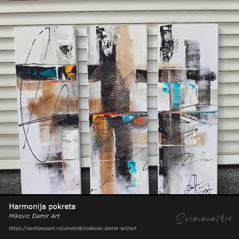 Ovaj apstraktni triptih donosi spoj energije i elegancije kroz igru boja, tekstura i linija. Dinamični koncentrični krugovi simbolizuju pokret i balans, dok tirkizni i narandžasti akcenti osvežavaju kompoziciju. Sa dimenzijama 70x60 cm (ukupno), ovo delo savršeno se uklapa u moderan enterijer, unoseći živost i umetničku notu u svaki prostor.