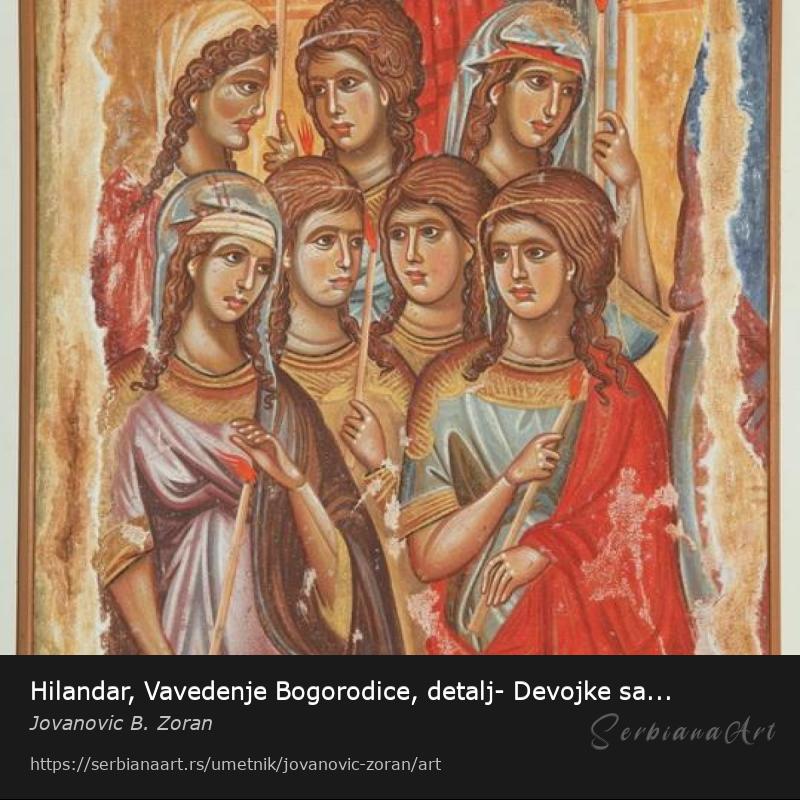 Manastir Hilandar (oko 1320.god.), kompozicija- Vavedenje Bogorodice, detalj: Devojke sa svećama, kopija ikone (rađena na platnu ). Ova kopija ikone je u posedu autora, a rok za izradu iste je po dogovoru (oko 25-30 dana).
