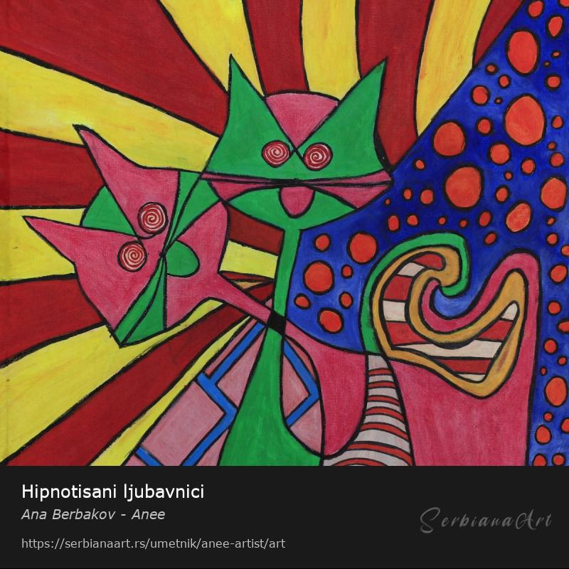 Na ovoj slici prikazane su dve lude mačke koje su zaljubljene i povezane stomakom i vratom. One su isprepletene u svojim emocijama. Emocije lete oko njih...