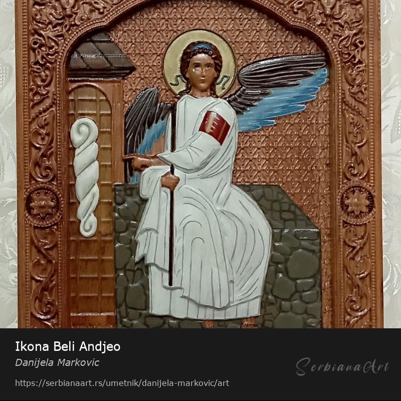 Rucno oslikana ikona Belog Andjela na Hristovom grobu. Duborez na bukovom drvetu, oslikan akrilnim bojama i zasticen lakom.