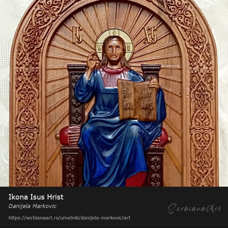 Rucno oslikana ikona Isusa Hrista. Duborez na bukovom drvetu, oslikan akrilnim bojama i zasticen lakom.