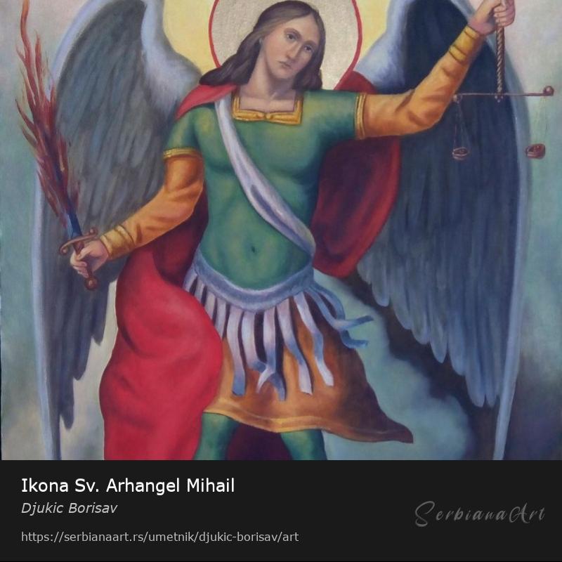 Ikona Svetog arhangela Mihaila ikonopisana je uljanim boljama na prepariranom platnu koje je zategnuto na blind ram. Ikona je radjena po uzoru na staru reprodukciju. Ikone mozete narucivati i po Vasoj reprodukciji.Podelite i promovišite ovo delo