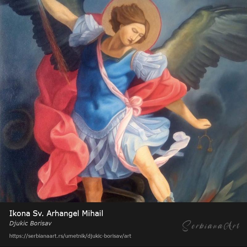 Ikona svetog arhangela Mihaila, radjena je uljanim bojama na prepariranom platnu koje je zategnuto na blind ram. Ikona je slikana po reprodukciji, naravno Vi mozete naruciti ikonu u bilij kojoj dimenziji i reprodukciji.Podelite i promovišite ovo delo