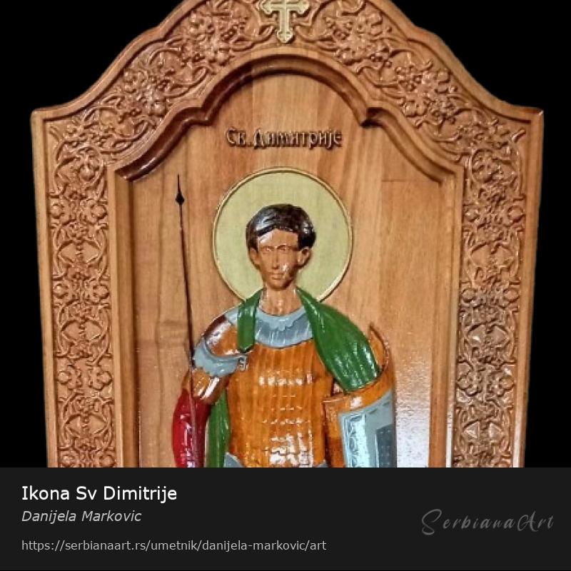 Rucno oslikana ikona Sv. Dimitrija. Duborez na bukovom drvetu, oslikan akrilnim bojama i zasticen lakom.