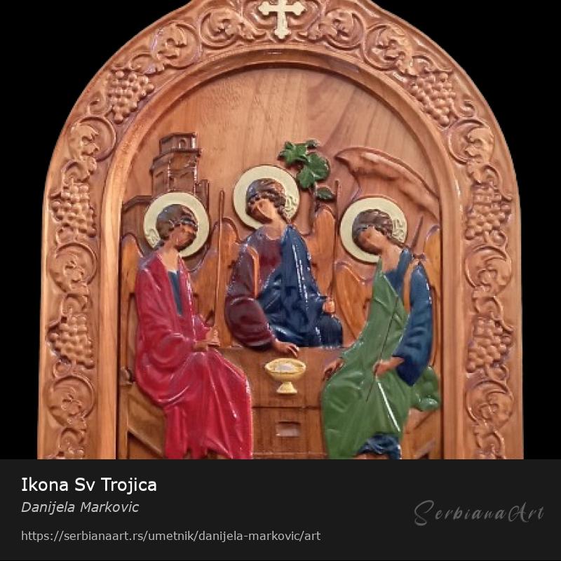 Rucno oslikana ikona Sv. Trojica. Duborez na bukovom drvetu, oslikan akrilnim bojama i zasticen lakom.