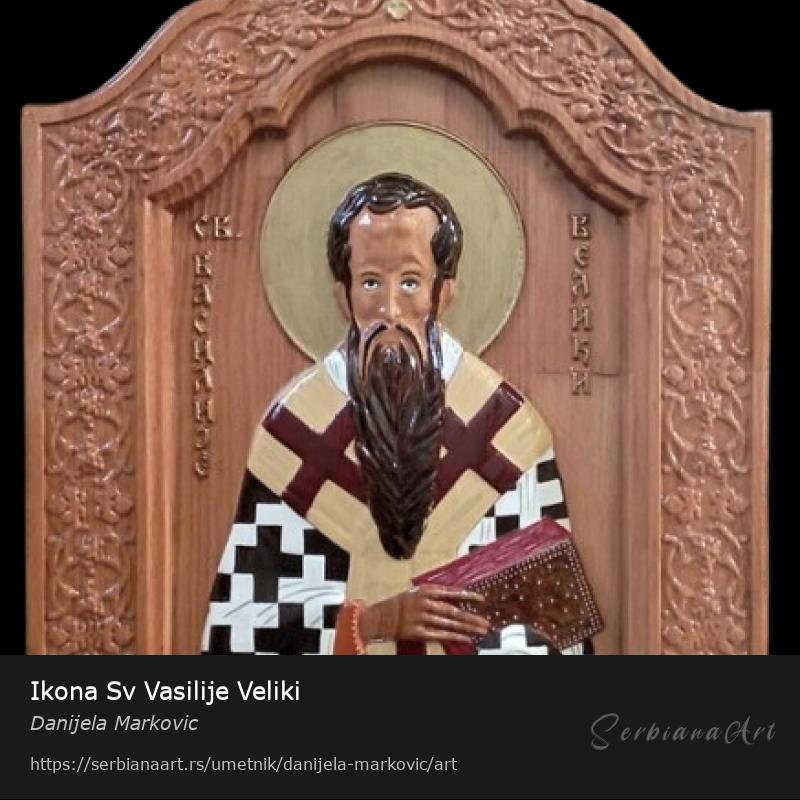 Rucno oslikana ikona Sv. Vasilije Veliki. Duborez na bukovom drvetu, oslikan akrilnim bojama i zasticen lakom.