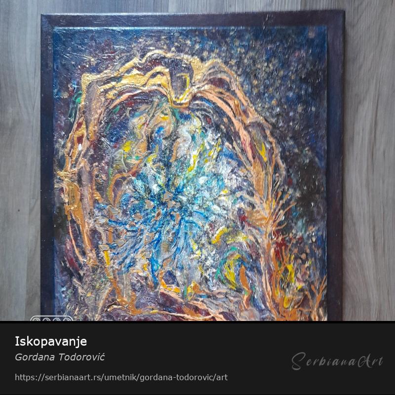 Originalan rad u mix tehnici sa sjajnim i zlatkastim nanosima.Izlagano delo na izlozbi u SAD.,u St.Luisu 2018 god.Platno na ramu neobicnog izgleda.Kontakt iml:gordana.todorovic47@gmail.com ili telefonom +38173344752.