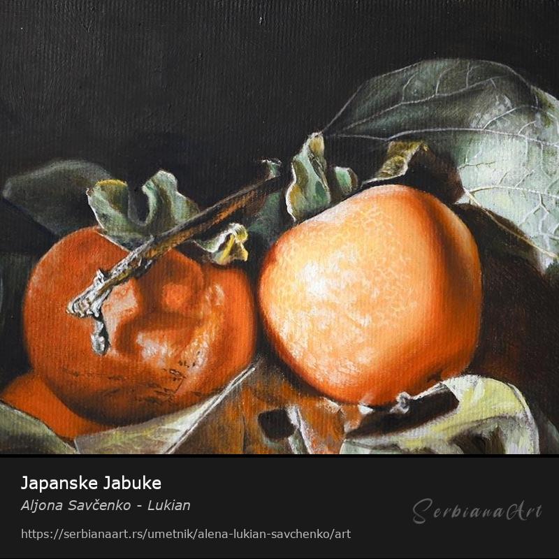 Ova slika, naslikana tehnikom ulja na platnu u stilu hiperrealizma, prikazuje dva zrela ploda kakija sa grančicom i lišćem. Realistični detalji teksture plodova, oštećenih listova i grane, stvaraju osećaj kao da su plodovi tek ubrani iz prirode. Duboka tamna pozadina naglašava toplu narandžastu boju kakija i bogate nijanse zelenog lišća, dajući slici elegantan kontrast. Veličina slike je 17x25 cm, a delo je uokvireno u prelepi drveni ram, što mu daje dodatni sjaj i savršenu prezentaciju za svaki enterijer.