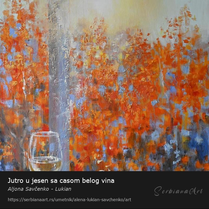 Autorska slika umetnice Alene Savčenko (Lukian). U prvom planu nalazi se providna čaša belog vina i dezert sa bobičastim voćem na reflektujućem stolu. U pozadini je plameni jesenji vrt u živim nijansama narandžaste, crvene i plave, stvarajući osećaj topline, udobnosti i uživanja u trenutku. Delo prenosi harmoniju sa prirodom i radost života.
