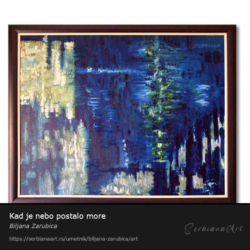 www.slika-ulje2005.comtel: +381(0)32 341 980GSM: +381(0)63 742 77 63Imam jednu vrstu sopstvene jasnoće i sreće koju sam samo ja mogla da prepoznam kod sebe. Za mene svako izgovoreno slovo i njime sklopljena reč ima određenu boju, ta boja nikad nije sama i nikad nije ista baš kao ni slovo u reči već se stalno međusobno prepliću, tako sam osetila da pored pisanog iskaza o nečemu to isto mogu da oslikam rukopisom boja i da se ta dva rukopisa slože i budu...