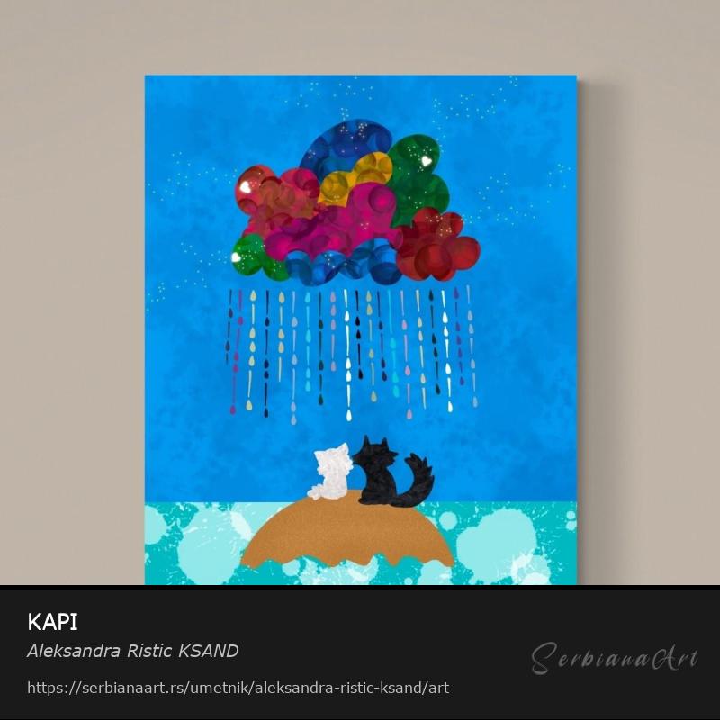 Zaronite u vibrantni svet "Kapi," slike koja prikazuje dve mačke—jednu belu i jednu crnu—kako mudro posmatraju izuzetno šaren oblak. Zadivljujuće obojene kapi padaju s neba, od kojih svaka predstavlja jedinstveno značenje svake kiše u životu—podsećajući nas da svaki izazov ili emocija nosi svoju boju i svrhu.